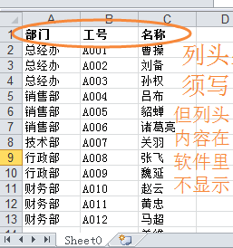 ■ 第一行为列头 需填写(不在软件显示)从A列开始,有几列写几列,不能有空列