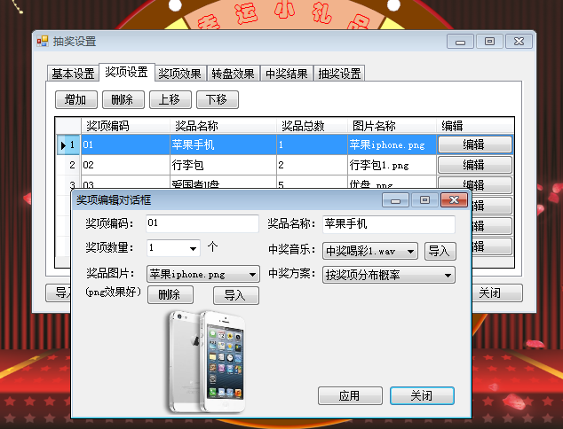 奖项设置:可设置多个奖项,添加修改或删除 / 可以导入奖项的图片,也可无图片。奖项名称不能为空,也不能有重复的名称。